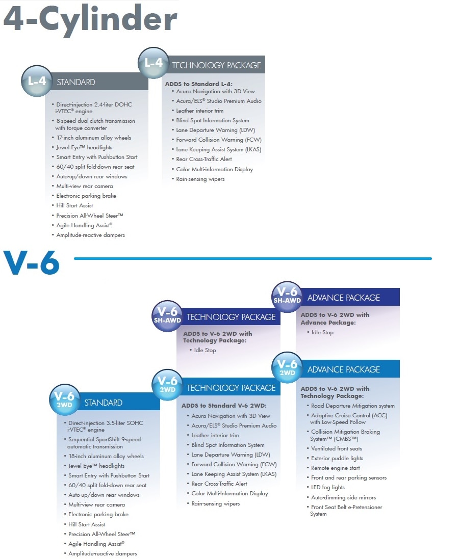 ·       The Acura TLX with a 3.5-liter 24-valve V-6 delivering 290-horsepower4 is mated to a new 9-speed automatic transmission (9AT) and will be available with both P-AWS and Super-Handling All-Wheel Drive? (SH-AWD®). The two-wheel-drive model with P-AWS has a MSRP of $35,220* and $39,250* for the Technology Package. The 3.5-liter TLX with Advance Package has a MSRP of $42,500*.Â