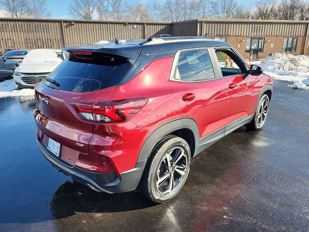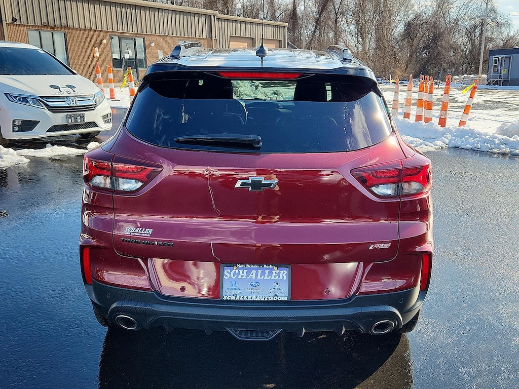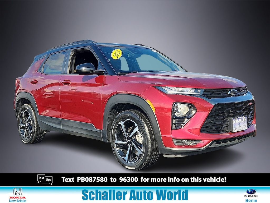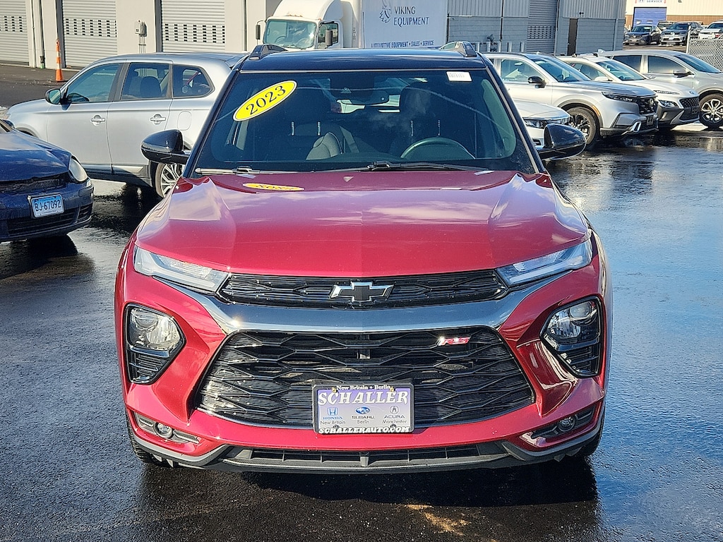 "Crimson Metallic 2023 Chevrolet TrailBlazer RS 1.3L Ecotec Turbo DOHC SIDI w/VVT CVT FWD1 Type-A & 1 Type-C USB Charging-Only Ports 120-Volt Power Outlet 2-Way Adjustable Front Head Restraints 2-Way Power Driver Lumbar Seat Adjuster 4-Way Manual Front Passenger Seat Adjuster 4-Wheel Disc Brakes 5.45 Axle Ratio 6-Speaker Audio System Feature 7""Diagonal Color Touchscreen 8-Way Power Driver Seat Adjuster 8""Diagonal Color Touchscreen Display ABS brakes Air Conditioning AM/FM radio: SiriusXM Auto High-beam Headlights Brake assist Bumpers: body-color Cabin Humidity Sensor Cloth w/Leatherette Seat Trim Compass Confidence II Package Convenience Package Delay-off headlights Driver & Front Passenger Illuminated Vanity Mirrors Driver door bin Driver vanity mirror Dual front impact airbags Dual front side impact airbags Electronic Stability Control Emergency communication system: OnStar and Chevrolet connected services capable Exterior Parking Camera Rear Flat-Folding Front Passenger Seatback Front anti-roll bar Front Bucket Seats Front Center Armrest Front fog lights Front License Plate Bracket Front reading lights Front wheel independent suspension Fully automatic headlights Heated door mirrors Heated Driver & Front Passenger Seats Heated front seats Heated Steering Wheel Heated steering wheel Illuminated entry Inside Rear-View Auto-Dimming Mirror Knee airbag Leather Shift Knob Leather steering wheel Low tire pressure warning Mosaic Black Metallic Two-Tone Roof Not Equipped w/Rear Park Assist Occupant sensing airbag Overhead airbag Overhead console Panic alarm Passenger door bin Passenger vanity mirror Power door mirrors Power driver seat Power steering Power windows Preferred Equipment Group 1RS Radio: Chevrolet Infotainment 3 System Rear Park Assist Rear seat center armrest Rear side impact airbag Rear window defroster Rear window wiper Remote keyless entry Ride & Handling Suspension Security system Single-Zone Auto Climate Control Air Conditioning SiriusXM Radio Speed control Split folding rear seat Spoiler Steering wheel mounted audio controls Tachometer Telescoping steering wheel Tilt steering wheel Traction control Trip computer Variably intermittent wipers Wheels: 18""High Gloss Black Machined Aluminum Wireless Apple CarPlay/Android Auto. Priced below KBB Fair Purchase Price! Odometer is 2998 miles below market average! 29/33 City/Highway MPGSchaller Auto Group has TWO Used Car Locations: Right off Route 9 in New Britain and Route 9 and the Berlin Turnpike in Berlin. Please call 860-826-2023 to confirm this Vehicle's Location. All of our Pre-Owned Vehicles go through our Comprehensive 125 Point Quality Inspection. Every Schaller pre-owned vehicle comes with warranty coverage! With all budgets in mind we now offer Schaller âValue Carsâ starting at $2995 and include a 30 day satisfaction guarantee and all come with a FREE Carfax Vehicle History Report. The Schaller Auto Group is Family Owned and Operated for Over 65 Years and is known for Selling Top Quality Used Vehicles and Standing behind them After the Sale!"