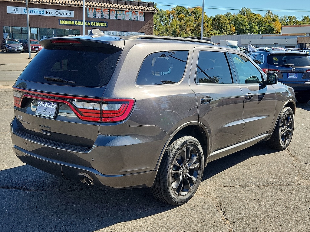 "Granite Metallic Clearcoat 2021 Dodge Durango GT Plus 3.6L V6 24V VVT 8-Speed Automatic AWD1-Year Trial (Registration Required) 10.1""Touchscreen Display 115V Auxiliary Power Outlet 180 Amp Alternator 2nd Row Fold/Tumble Captain Chairs 2nd Row Mini Console w/Cupholders 2nd Row Seat Mounted Inboard Armrests 3.45 Rear Axle Ratio 3rd Row Floor Mat & Mini Console 3rd row seats: split-bench 4-Wheel Disc Brakes 4G LTE Wi-Fi Hot Spot 506 Watt Amplifier 6 Speakers 6-Passenger Seating 9 Alpine Amplified Speakers w/Subwoofer ABS brakes Air Conditioning Alloy wheels AM/FM radio: SiriusXM Anti-whiplash front head restraints Apple CarPlay Apple CarPlay/Android Auto Auto-Dimming Exterior Driver Mirror Auto-dimming Rear-View mirror Automatic temperature control Black Roof Rails Blacktop Package Blind Spot & Cross Path Detection Brake assist Bumpers: body-color Cloth Bucket Seats w/Shift Insert Compass Connected Travel & Traffic Services Delay-off headlights Disassociated Touchscreen Display Driver door bin Driver vanity mirror Dual front impact airbags Dual front side impact airbags Dual Remote USB Port - Charge Only Electronic Stability Control Exterior Mirrors w/Memory Exterior Mirrors w/Supplemental Signals For Details Visit DriveUconnect.com Four wheel independent suspension Front anti-roll bar Front Bucket Seats Front Center Armrest w/Storage Front dual zone A/C Front fog lights Front License Plate Bracket Front reading lights Fully automatic headlights Global Telematics Box Module (TBM) Gloss Black Badges Gloss Black Exterior Mirrors Google Android Auto GPS Antenna Input GPS Navigation GT Gloss Black Badging HD Radio Heated door mirrors Heated Front Seats Heated Second Row Seats Heated Steering Wheel Illuminated entry Integrated Center Stack Radio Integrated Roof Rail Crossbars Integrated Voice Command w/Bluetooth Knee airbag Leather steering wheel Leather Suede Bucket Seats Low tire pressure warning Occupant sensing airbag Outside temperature display Overhead airbag Overhead console Panic alarm ParkView Rear Back-Up Camera Passenger door bin Passenger vanity mirror Power 6x9 Multi-Function Foldaway Mirrors Power 8-Way Driver Memory 6-Way Passenger Seats Power door mirrors Power driver seat Power Driver/Passenger 4-Way Lumbar Adjust Power Liftgate Power steering Power Sunroof Power windows Premium Group I Quick Order Package 2BE GT Plus Radio data system Radio: Uconnect 4 w/8.4""Display Radio: Uconnect 5 Nav w/10.1""Display Radio/Driver Seat/Mirrors Memory Rear air conditioning Rear anti-roll bar Rear reading lights Rear seat center armrest Rear window defroster Rear window wiper Remote keyless entry Remote Start System Satin Black Dodge Tail Lamp Badge Security Alarm SiriusXM Guardian - Included Trial (B) SiriusXM Satellite Radio SiriusXM w/360L Speed control Speed-sensing steering Speed-Sensitive Wipers Split folding rear seat Spoiler Steering wheel mounted audio controls Sun Visors w/Illuminated Vanity Mirrors Tachometer Telescoping steering wheel Tilt steering wheel Traction control Trip computer Tungsten Accent Stitching Tungsten Interior Accent Stitch Universal Garage Door Opener USB Host Flip Variably intermittent wipers Voltmeter Wheels: 20""x 8.0""Black Noise Aluminum Wheels: 20""x 8.0""Fine Silver. Priced below KBB Fair Purchase Price!Schaller Auto Group has TWO Used Car Locations: Right off Route 9 in New Britain and Route 9 and the Berlin Turnpike in Berlin. Please call 860-826-2023 to confirm this Vehicle's Location. All of our Pre-Owned Vehicles go through our Comprehensive 125 Point Quality Inspection. Every Schaller pre-owned vehicle comes with warranty coverage! With all budgets in mind we now offer Schaller âValue Carsâ starting at $2995 and include a 30 day satisfaction guarantee and all come with a FREE Carfax Vehicle History Report. The Schaller Auto Group is Fami"