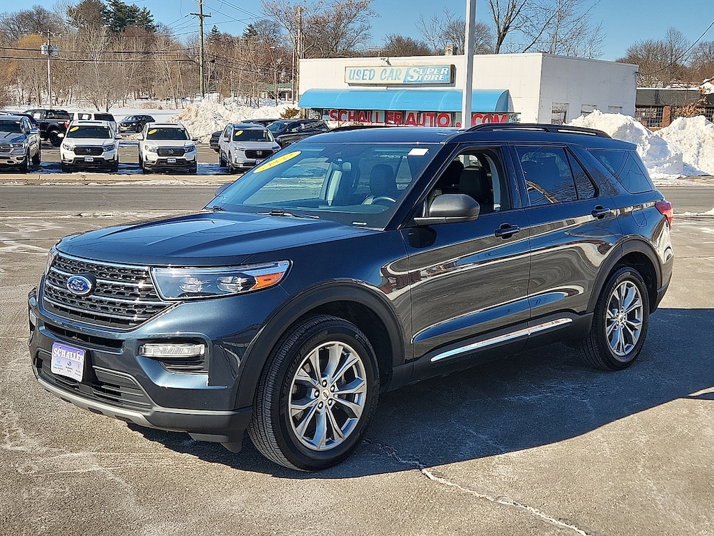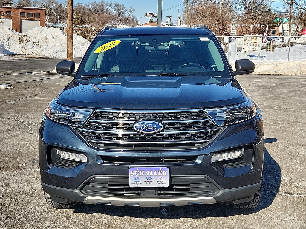 Stone Blue Metallic 2022 Ford Explorer XLT 2.3L EcoBoost I-4 10-Speed Automatic 4WD1st Row Heated Seats 2nd Row 35/30/35 Bench w/E-Z Entry & Armrest 3.58 Non-Limited-Slip Rear Axle Ratio 3rd row seats: bench 4-Wheel Disc Brakes 6 Speakers ABS brakes Acoustic-Laminated Front Side Windows ActiveX Captain's Chairs Air Conditioning Alloy wheels AM/FM radio: SiriusXM AM/FM Stereo Auto High-beam Headlights Auto Start-Stop Removal Automatic temperature control Brake assist Bumpers: body-color Compass Delay-off headlights Driver door bin Driver vanity mirror Dual front impact airbags Dual front side impact airbags Electronic Stability Control Emergency communication system: SYNC 3 911 Assist Equipment Group 202A Exterior Parking Camera Rear FordPass Connect Four wheel independent suspension Front anti-roll bar Front Bucket Seats Front Center Armrest Front dual zone A/C Front reading lights Fully automatic headlights Heated door mirrors Heated front seats Heated Steering Wheel Illuminated entry Knee airbag Leather steering wheel LED Fog Lamps Low tire pressure warning Occupant sensing airbag Outside temperature display Overhead airbag Overhead console Panic alarm Passenger door bin Passenger vanity mirror Power door mirrors Power driver seat Power Liftgate Power passenger seat Power steering Power windows Rear air conditioning Rear anti-roll bar Rear Auxiliary Controls Credit Rear reading lights Rear window defroster Rear window wiper Remote keyless entry Remote Start System Roof rack: rails only SecuriCode Keyless Entry Keypad Security system Speed control Speed-sensing steering Speed-Sensitive Wipers Split folding rear seat Spoiler Steering wheel mounted audio controls SYNC 3 Communications & Entertainment System SYNC 3/Apple CarPlay/Android Auto Tachometer Telescoping steering wheel Tilt steering wheel Traction control Trip computer Twin Panel Moonroof Unique Cloth Captain's Chairs Variably intermittent wipers. 20/27 City/Highway MPGSchaller Auto Group has TWO Used Car Locations: Right off Route 9 in New Britain and Route 9 and the Berlin Turnpike in Berlin. Please call 860-826-2023 to confirm this Vehicle's Location. All of our Pre-Owned Vehicles go through our Comprehensive 125 Point Quality Inspection. Every Schaller pre-owned vehicle comes with warranty coverage! With all budgets in mind we now offer Schaller âValue Carsâ starting at $2995 and include a 30 day satisfaction guarantee and all come with a FREE Carfax Vehicle History Report. The Schaller Auto Group is Family Owned and Operated for Over 65 Years and is known for Selling Top Quality Used Vehicles and Standing behind them After the Sale!