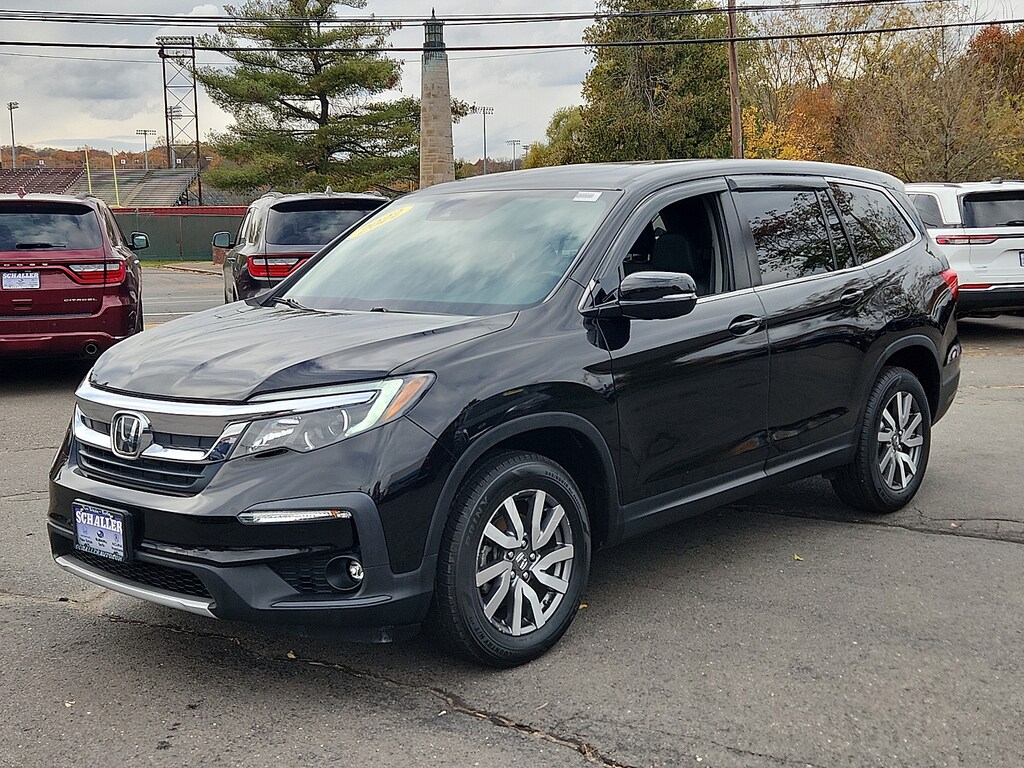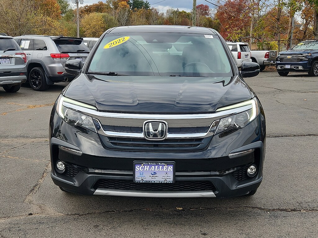 "Black 2022 Honda Pilot EX-L 3.5L V6 24V SOHC i-VTEC 9-Speed Automatic AWD18""Machine-Finished Alloy Wheels 3rd row seats: split-bench 4-Wheel Disc Brakes 4.33 Axle Ratio 7 Speakers A/V remote: CabinControl ABS brakes Air Conditioning Alloy wheels AM/FM radio: SiriusXM Apple CarPlay/Android Auto Auto High-beam Headlights Auto-dimming Rear-View mirror Automatic temperature control Blind Spot Information (BSI) System warning Brake assist Bumpers: body-color Delay-off headlights Driver door bin Driver vanity mirror Dual front impact airbags Dual front side impact airbags Electronic Stability Control Emergency communication system: HondaLink Assist Exterior Parking Camera Rear Forward collision: Collision Mitigation Braking System (CMBS) + FCW mitigation Four wheel independent suspension Front anti-roll bar Front Bucket Seats Front Center Armrest Front dual zone A/C Front fog lights Front reading lights Fully automatic headlights Garage door transmitter: HomeLink Heated door mirrors Heated Front Bucket Seats Heated front seats Illuminated entry Lane departure: Lane Keeping Assist System (LKAS) active Leather Seat Trim Low tire pressure warning Memory seat Occupant sensing airbag Outside temperature display Overhead airbag Overhead console Panic alarm Passenger door bin Passenger vanity mirror Power door mirrors Power driver seat Power Liftgate Power moonroof Power passenger seat Power steering Power windows Radio data system Radio: 215-Watt Audio System Rear air conditioning Rear anti-roll bar Rear reading lights Rear seat center armrest Rear window defroster Rear window wiper Reclining 3rd row seat Remote keyless entry Security system Speed control Speed-sensing steering Speed-Sensitive Wipers Split folding rear seat Spoiler Steering wheel mounted audio controls Tachometer Telescoping steering wheel Tilt steering wheel Traction control Trip computer Turn signal indicator mirrors Variably intermittent wipers. 19/26 City/Highway MPGSchaller Auto Group has TWO Used Car Locations: Right off Route 9 in New Britain and Route 9 and the Berlin Turnpike in Berlin. Please call 860-826-2023 to confirm this Vehicle's Location. All of our Pre-Owned Vehicles go through our Comprehensive 125 Point Quality Inspection. Every Schaller pre-owned vehicle comes with warranty coverage! With all budgets in mind we now offer Schaller âValue Carsâ starting at $2995 and include a 30 day satisfaction guarantee and all come with a FREE Carfax Vehicle History Report. The Schaller Auto Group is Family Owned and Operated for Over 65 Years and is known for Selling Top Quality Used Vehicles and Standing behind them After the Sale!"