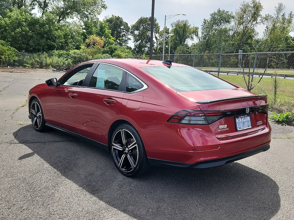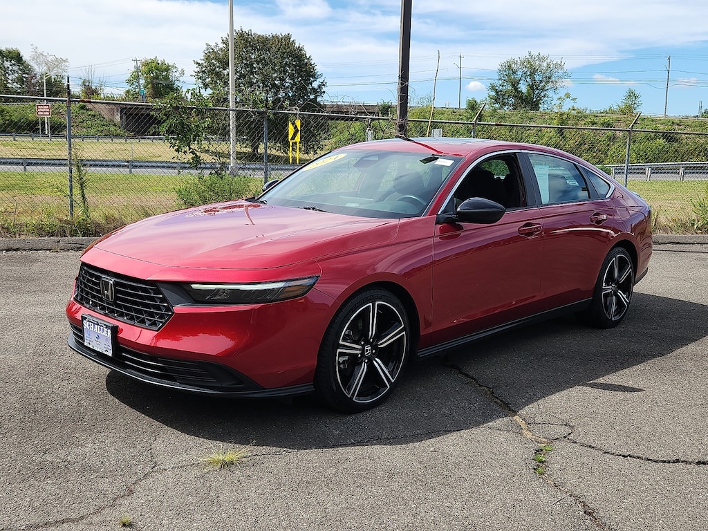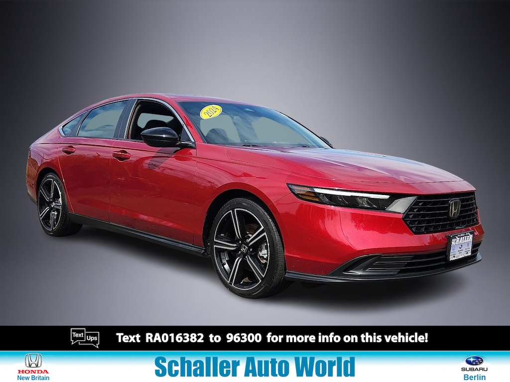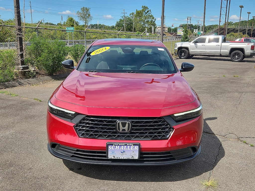 "Radiant Red 2024 Honda Accord Hybrid Sport 2.0L 16V DOHC eCVT FWDHONDA CERTIFIED PRE-OWNED WARRANTY / CPO 4-Wheel Disc Brakes 8 Speakers ABS brakes Adaptive Cruise Control: Adaptive Cruise Control (ACC) with Low-Speed Follow Air Conditioning Alloy wheels AM/FM radio Apple CarPlay/Android Auto Auto High-beam Headlights Automatic temperature control Blind Spot Information (BSI) System warning Brake assist Bumpers: body-color Compass Delay-off headlights Driver door bin Driver vanity mirror Dual front impact airbags Dual front side impact airbags Electronic Stability Control Emergency communication system: HondaLink Exterior Parking Camera Rear Fabric Seat Trim Four wheel independent suspension Front anti-roll bar Front Bucket Seats Front Center Armrest Front dual zone A/C Front reading lights Fully automatic headlights Illuminated entry Knee airbag Lane departure: Lane Keeping Assist System (LKAS) active Leather Shift Knob Leather steering wheel Low tire pressure warning Occupant sensing airbag Outside temperature display Overhead airbag Overhead console Panic alarm Passenger door bin Passenger vanity mirror Power door mirrors Power driver seat Power moonroof Power steering Power windows Radio data system Radio: 180-Watt Audio System Rear anti-roll bar Rear reading lights Rear seat center armrest Rear side impact airbag Rear window defroster Remote keyless entry Security system Speed control Speed-sensing steering Speed-Sensitive Wipers Split folding rear seat Spoiler Steering wheel mounted audio controls Telescoping steering wheel Tilt steering wheel Traction control Trip computer Variably intermittent wipers Wheels: 19""x 8.5J Berlina Black. 46/41 City/Highway MPGHondaTrue Certified Details: * Powertrain Limited Warranty: 84 Month/100000 Mile (whichever comes first) from original in-service date * Vehicle History * 182 Point Inspection * Transferable Warranty * Limited Warranty: 24 Month/100000 Mile (whichever comes first) after new car warranty expires or from certified purchase date * Roadside Assistance * Warranty Deductible: $0 * Vehicles purchased within New Vehicle Limited Warranty period: extends New Vehicle Limited Warranty to 5 years*/60000 miles*. Honda Care Roadside Assistance for 2 year/100000 miles (whichever occurs first). Up to two complimentary oil changes within the first year of ownership. SiriusXM 90-Day Trial.Schaller Auto Group has TWO Used Car Locations: Right off Route 9 in New Britain and Route 9 and the Berlin Turnpike in Berlin. Please call 860-826-2023 to confirm this Vehicle's Location. All of our Pre-Owned Vehicles go through our Comprehensive 125 Point Quality Inspection. Every Schaller pre-owned vehicle comes with warranty coverage! With all budgets in mind we now offer Schaller âValue Carsâ starting at $2995 and include a 30 day satisfaction guarantee and all come with a FREE Carfax Vehicle History Report. The Schaller Auto Group is Family Owned and Operated for Over 65 Years and is known for Selling Top Quality Used Vehicles and Standing behind them After the Sale!"