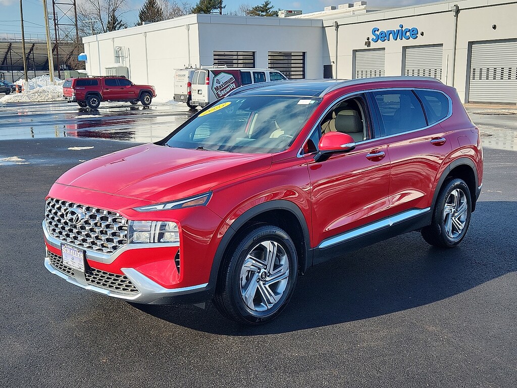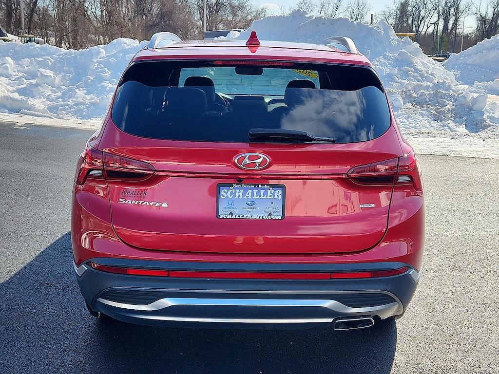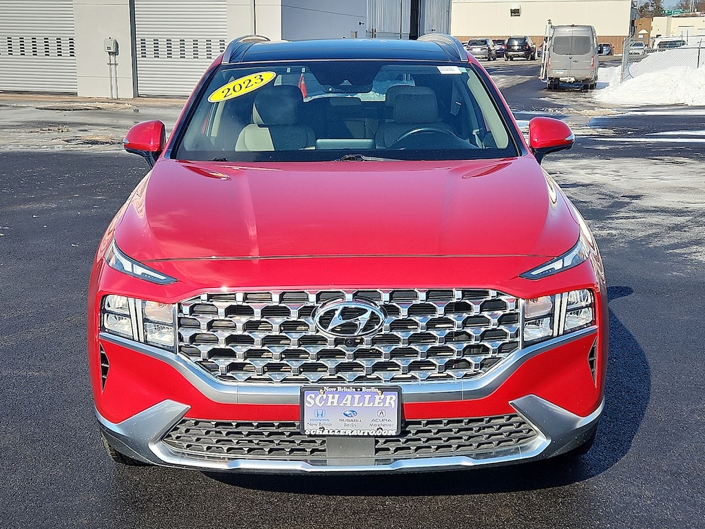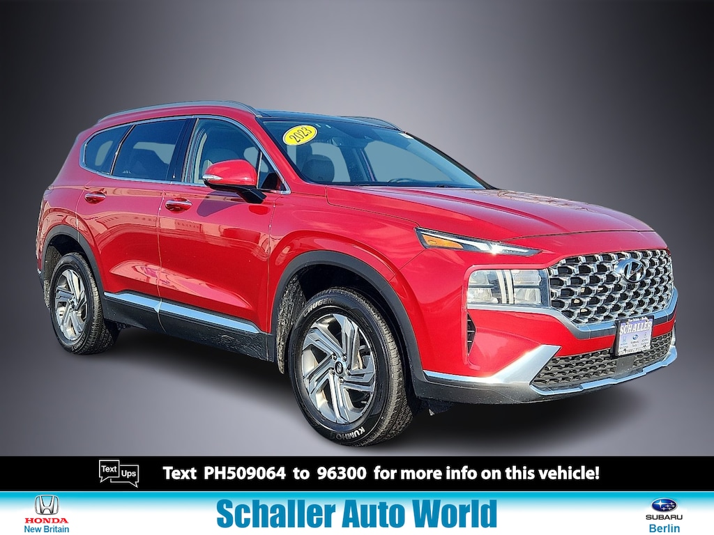 "Calypso Red 2023 Hyundai Santa Fe SEL 2.5L I4 8-Speed Automatic with SHIFTRONIC AWD12.3""LCD Multi-Information Display 18""x 7.5J Alloy Wheels 4-Wheel Disc Brakes 6 Speakers 8-Way Power Passenger Seat ABS brakes Acoustic-Laminated Front Side Windows Air Conditioning Alloy wheels AM/FM radio: SiriusXM Apple CarPlay & Android Auto Auto High-beam Headlights Auto-Dimming Rear-View Mirror Automatic temperature control Axle Ratio: 4.081 Blind-Spot View Monitor Brake assist Bumper Applique Bumpers: body-color Cargo Net Cargo Package Cargo Tray Carpeted Floor Mats Chrome Front & Rear Bumper Accents Chrome Interior Accents Delay-off headlights Driver door bin Driver vanity mirror Dual front impact airbags Dual front side impact airbags Electronic Stability Control Emergency communication system Exterior Parking Camera Rear First Aid Kit Four wheel independent suspension Front anti-roll bar Front Bucket Seats Front Center Armrest Front dual zone A/C Front reading lights Fully automatic headlights H-Tex Leatherette Seat Trim harman/kardon® Audio System Heated door mirrors Heated Front Bucket Seats Heated front seats Illuminated entry Leather steering wheel LED Interior Lights LED Taillights Low tire pressure warning Manual Rear Side Sunshades Mudguards Navigation System Occupant sensing airbag Option Group 02 Outside temperature display Overhead airbag Overhead console Panic alarm Panoramic Sunroof Passenger door bin Passenger vanity mirror Power door mirrors Power driver seat Power Liftgate Power Release 2nd Row Seats Power steering Power windows Premium Package Radio: AM/FM Display Audio Rear anti-roll bar Rear seat center armrest Rear window defroster Rear window wiper Remote keyless entry Security system Silver Front Grille Speed control Speed-sensing steering Split folding rear seat Spoiler Stain-Resistant Cloth Seat Trim Steering wheel mounted audio controls Surround View Monitor Tachometer Telescoping steering wheel Tilt steering wheel Traction control Trip computer Turn signal indicator mirrors Variably intermittent wipers. Odometer is 6774 miles below market average!Schaller Auto Group has TWO Used Car Locations: Right off Route 9 in New Britain and Route 9 and the Berlin Turnpike in Berlin. Please call 860-826-2023 to confirm this Vehicle's Location. All of our Pre-Owned Vehicles go through our Comprehensive 125 Point Quality Inspection. Every Schaller pre-owned vehicle comes with warranty coverage! With all budgets in mind we now offer Schaller âValue Carsâ starting at $2995 and include a 30 day satisfaction guarantee and all come with a FREE Carfax Vehicle History Report. The Schaller Auto Group is Family Owned and Operated for Over 65 Years and is known for Selling Top Quality Used Vehicles and Standing behind them After the Sale!"