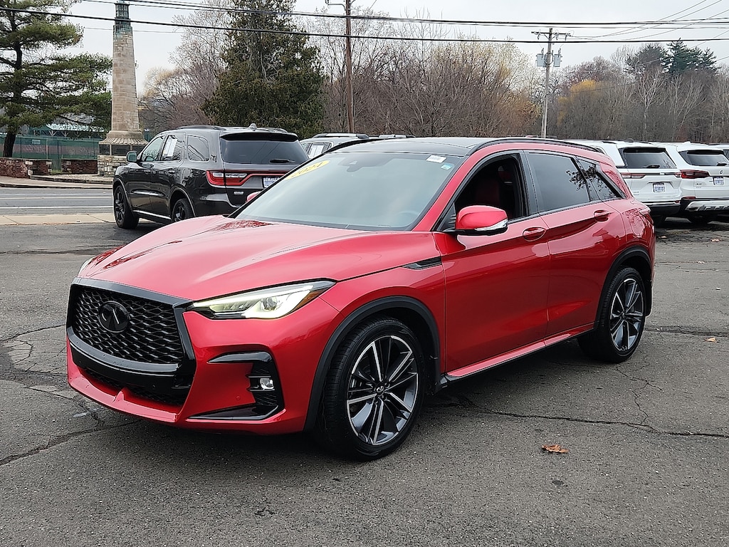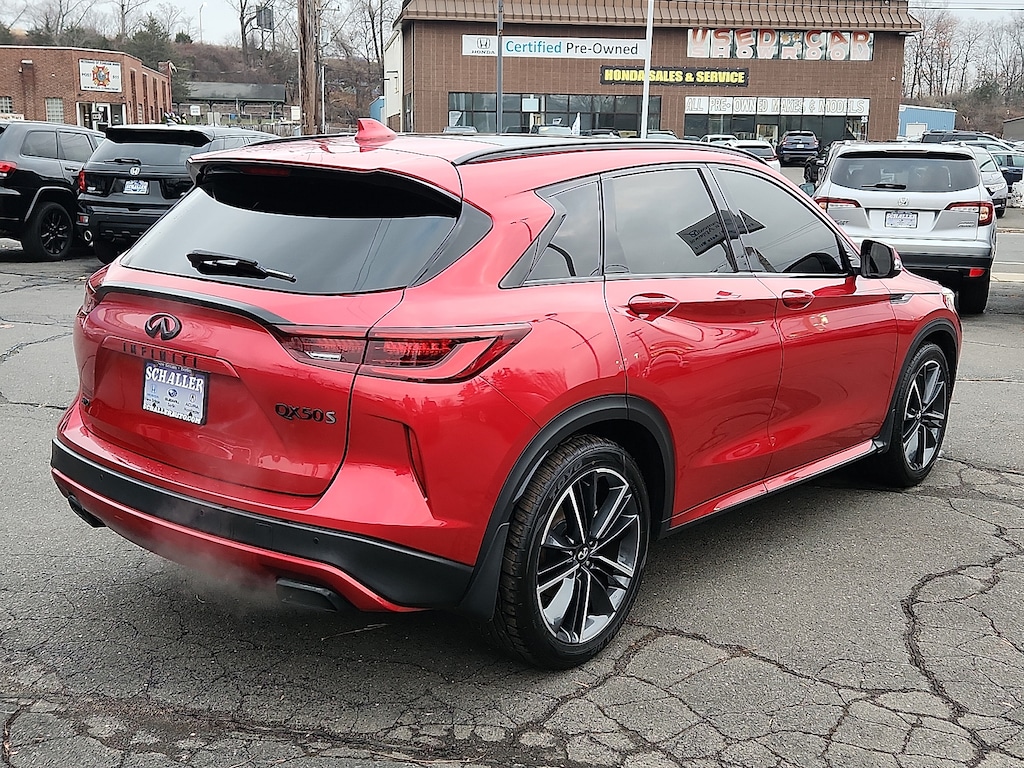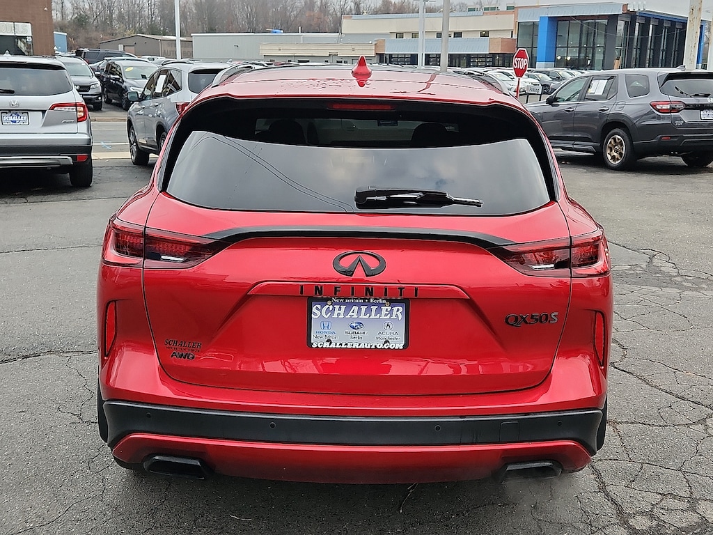 "Dynamic Sunstone Red 2024 INFINITI QX50 SPORT I4 CVT AWD12 Speakers 4-Wheel Disc Brakes 5.846 Axle Ratio ABS brakes Air Conditioning AM/FM radio: SiriusXM Auto High-beam Headlights Auto-dimming Rear-View mirror Automatic temperature control Bose Premium Audio System Brake assist Bumpers: body-color CD player Climate Controlled Front Bucket Seats Delay-off headlights Driver door bin Driver vanity mirror Dual front impact airbags Dual front side impact airbags Electronic Stability Control Emergency communication system: INFINITI InTouch (1-year complimentary trial) Exterior Parking Camera Rear Floor Mats Four wheel independent suspension Front anti-roll bar Front Bucket Seats Front Center Armrest Front dual zone A/C Front fog lights Front reading lights Fully automatic headlights Garage door transmitter: HomeLink Heated door mirrors Heated front seats Heated steering wheel Illuminated entry Illuminated Kick Plates Knee airbag Leather Shift Knob Leather steering wheel Literature Kit Low tire pressure warning Memory seat Navigation system: INFINITI InTouch Navigation Occupant sensing airbag Outside temperature display Overhead airbag Overhead console Panic alarm Passenger door bin Passenger vanity mirror Power door mirrors Power driver seat Power Liftgate Power moonroof Power passenger seat Power steering Power windows Radio data system Rear anti-roll bar Rear reading lights Rear seat center armrest Rear side impact airbag Rear window defroster Rear window wiper Remote keyless entry Security system Semi-Aniline Leather-Appointed Seat Trim Speed control Speed-sensing steering Speed-Sensitive Wipers Splash Guards (Set of 4) Split folding rear seat Spoiler Steering wheel mounted audio controls Tachometer Telescoping steering wheel Tilt steering wheel Traction control Trip computer Turn signal indicator mirrors Variably intermittent wipers Ventilated front seats Wheels: 20""Dark-Painted Machine-Finished Alloy. Priced below KBB Fair Purchase Price! 22/28 City/Highway MPGSchaller Auto Group has TWO Used Car Locations: Right off Route 9 in New Britain and Route 9 and the Berlin Turnpike in Berlin. Please call 860-826-2023 to confirm this Vehicle's Location. All of our Pre-Owned Vehicles go through our Comprehensive 125 Point Quality Inspection. Every Schaller pre-owned vehicle comes with warranty coverage! With all budgets in mind we now offer Schaller âValue Carsâ starting at $2995 and include a 30 day satisfaction guarantee and all come with a FREE Carfax Vehicle History Report. The Schaller Auto Group is Family Owned and Operated for Over 65 Years and is known for Selling Top Quality Used Vehicles and Standing behind them After the Sale!"