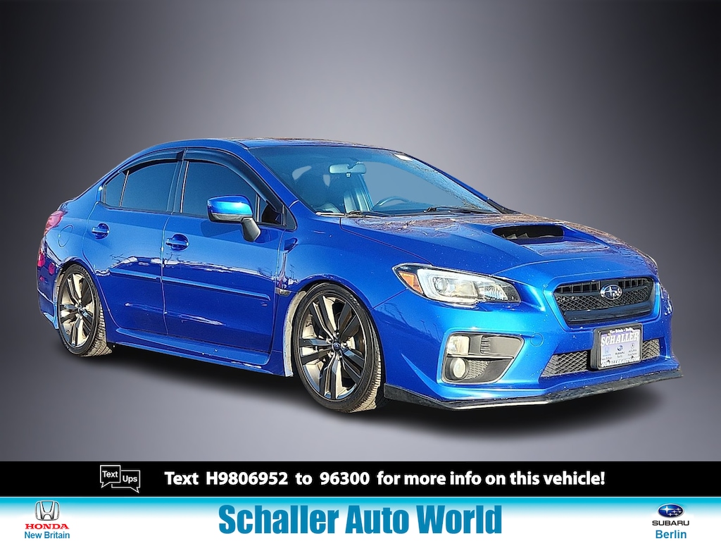 "WR Blue Pearl 2017 Subaru WRX Limited 2.0L DOHC Intercooled Turbocharged 6-Speed Manual AWD4-Wheel Disc Brakes 6 Speakers ABS brakes Air Conditioning AM/FM radio: SiriusXM Automatic temperature control Brake assist Bumpers: body-color CD player Delay-off headlights Driver door bin Driver vanity mirror Dual front impact airbags Dual front side impact airbags Electronic Stability Control Exterior Parking Camera Rear Four wheel independent suspension Front anti-roll bar Front Bucket Seats Front Center Armrest Front fog lights Front reading lights Fully automatic headlights Heated door mirrors Heated front seats Illuminated entry Knee airbag Leather Shift Knob Leather steering wheel Limited Model Low tire pressure warning Occupant sensing airbag Outside temperature display Overhead airbag Overhead console Panic alarm Passenger door bin Passenger vanity mirror Perforated Leather-Trimmed Upholstery Performance Design Heated Front Bucket Seats Power door mirrors Power driver seat Power moonroof Power steering Power windows Radio data system Radio: Subaru Starlink 7.0""Multimedia Plus System Rear anti-roll bar Rear window defroster Remote keyless entry Security system Speed control Split folding rear seat Spoiler Sport steering wheel Steering wheel mounted audio controls Tachometer Telescoping steering wheel Tilt steering wheel Traction control Trip computer Variably intermittent wipers Wheels: 18""x 8.5J Aluminum Alloy w/Gray Finish. Priced below KBB Fair Purchase Price! 20/27 City/Highway MPGAwards: * ALG Residual Value Awards Residual Value Awards * 2017 IIHS Top Safety Pick * 2017 KBB.com Best Resale Value Awards * 2017 KBB.com Brand Image Awards * 2017 KBB.com 10 Most Awarded Brands * 2017 KBB.com 5-Year Cost to Own AwardsSchaller Auto Group has TWO Used Car Locations: Right off Route 9 in New Britain and Route 9 and the Berlin Turnpike in Berlin. Please call 860-826-2023 to confirm this Vehicle's Location. All of our Pre-Owned Vehicles go through our Comprehensive 125 Point Quality Inspection. Every Schaller pre-owned vehicle comes with warranty coverage! With all budgets in mind we now offer Schaller âValue Carsâ starting at $2995 and include a 30 day satisfaction guarantee and all come with a FREE Carfax Vehicle History Report. The Schaller Auto Group is Family Owned and Operated for Over 65 Years and is known for Selling Top Quality Used Vehicles and Standing behind them After the Sale!"