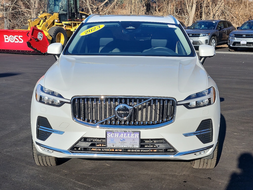 "Crystal White Metallic 2023 Volvo XC60 B5 Plus Bright Theme 2.0L I4 Turbocharged Automatic with Geartronic AWD10 Speakers 4-Wheel Disc Brakes ABS brakes Air Conditioning AM/FM radio: SiriusXM Anti-whiplash front head restraints Apple CarPlay Auto High-beam Headlights Auto-dimming door mirrors Auto-dimming Rear-View mirror Automatic temperature control Brake assist Bumpers: body-color Delay-off headlights Driver door bin Driver vanity mirror Dual front impact airbags Dual front side impact airbags Electronic Stability Control Emergency communication system: Volvo Cars App w/4 Year Subscription Exterior Parking Camera Rear Four wheel independent suspension Front anti-roll bar Front Bucket Seats Front Center Armrest Front dual zone A/C Front fog lights Front reading lights Fully automatic headlights Garage door transmitter: HomeLink Genuine wood console insert Genuine wood dashboard insert Heated door mirrors Heated Front Bucket Seats Heated front seats Illuminated entry Knee airbag Leather Shift Knob Leather Upholstery Low tire pressure warning Memory seat Occupant sensing airbag Outside temperature display Overhead airbag Panic alarm Passenger door bin Passenger vanity mirror Power door mirrors Power driver seat Power moonroof Power passenger seat Power steering Power windows Radio data system Radio: High Performance Audio System Rain sensing wipers Rear anti-roll bar Rear fog lights Rear reading lights Rear seat center armrest Rear window defroster Rear window wiper Remote keyless entry Security system Speed control Split folding rear seat Spoiler Steering wheel mounted audio controls Tachometer Telescoping steering wheel Tilt steering wheel Traction control Trip computer Turn signal indicator mirrors Variably intermittent wipers Wheels: 19""5-V Spoke Black Diamond Cut Alloy. Priced below KBB Fair Purchase Price! Odometer is 7261 miles below market average! 23/29 City/Highway MPGSchaller Auto Group has TWO Used Car Locations: Right off Route 9 in New Britain and Route 9 and the Berlin Turnpike in Berlin. Please call 860-826-2023 to confirm this Vehicle's Location. All of our Pre-Owned Vehicles go through our Comprehensive 125 Point Quality Inspection. Every Schaller pre-owned vehicle comes with warranty coverage! With all budgets in mind we now offer Schaller âValue Carsâ starting at $2995 and include a 30 day satisfaction guarantee and all come with a FREE Carfax Vehicle History Report. The Schaller Auto Group is Family Owned and Operated for Over 65 Years and is known for Selling Top Quality Used Vehicles and Standing behind them After the Sale!"